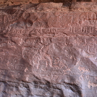 Jordan. Wadi Rum, Khazali canyon, rock art, Thamudic and Arabic inscriptions