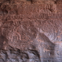 Jordan. Wadi Rum, Khazali canyon, rock art, Thamudic and Arabic inscriptions