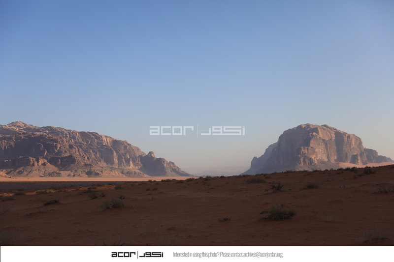 Jordan. Wadi Rum, general view of desert with mountains in background