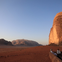 Jordan. Wadi Rum, group of Bedouin men at campsite