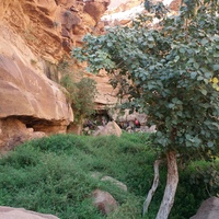 Jordan. Wadi Rum, Ain Shallaleh, local youth in the background, tree and bushes in the foreground