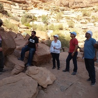 Jordan. Wadi Rum, path to Ain Shallaleh, Glenn Corbett of ACOR provides context on rock art to SCHEP and USAID members