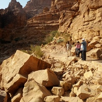Jordan. Wadi Rum, path to Ain Shallaleh, Jehad Haron pointing to rock art from pathway, with Mohammed Domyan of the Wadi Rum Protected Area and Glenn Corbett of ACOR