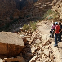 Jordan. Wadi Rum, Ain Shallaleh, SCHEP and USAID teams view rock art from pathway