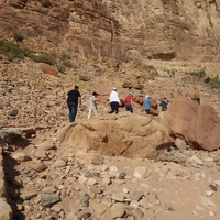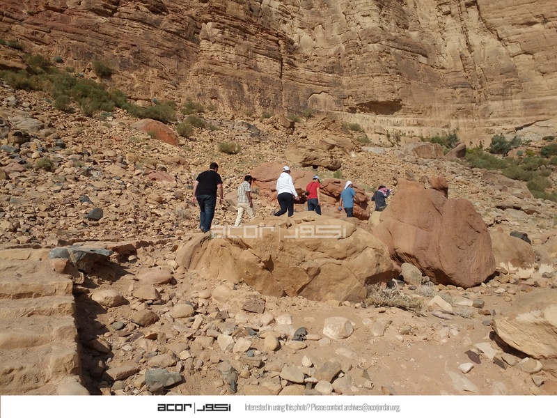 Jordan. Wadi Rum, path to Ain Shallaleh, SCHEP and USAID teams walking along pathway