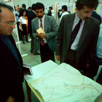 Jordan. Irbid, International Conference on the History and Archaeology of Jordan (ICHAJ) 5th conference, 12-17 April 1992. From left: Michele Piccirillo, Hakim Mahameed, Zbigniew Fiema. Background: Muna Zaghloul, Former Head of Publications at the Departm