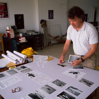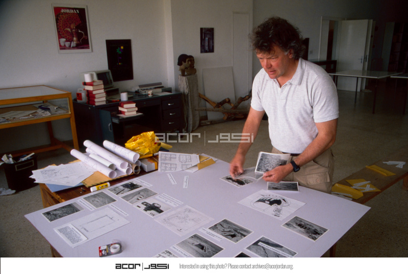 Jordan. ACOR Lower Library. John Oleson preparing exhibition materials for Irbid, International Conference on the History and Archaeology of Jordan (ICHAJ) 5th conference, 12-17 April 1992.