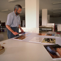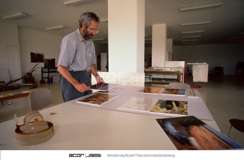 Jordan. ACOR Lower Library. Bert De Vries preparing exhibition materials for Irbid, International Conference on the History and Archaeology of Jordan (ICHAJ) 5th conference, 12-17 April 1992.