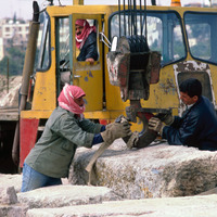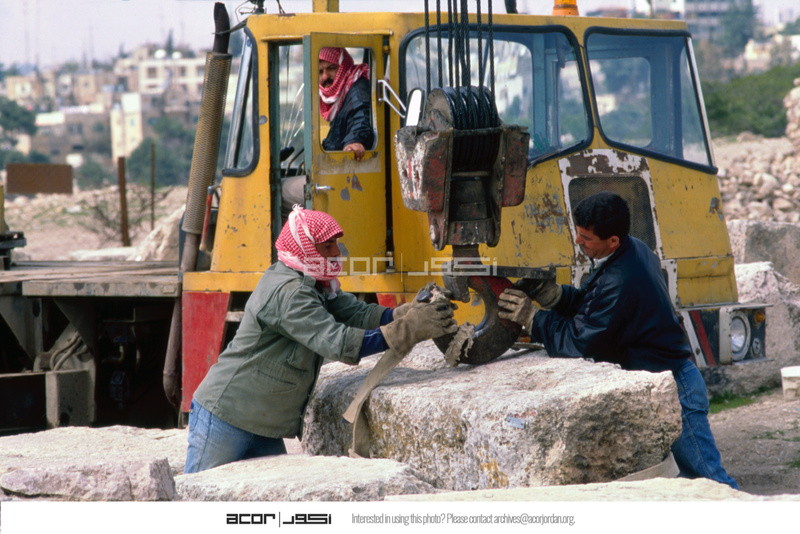 Jordan. Amman Citadel, Jabal Al Qala'a, during reconstruction of Temple of Hercules with site technical workers (?)