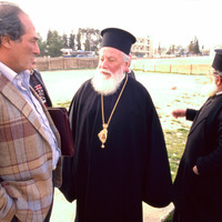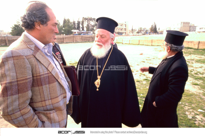 Jordan. Madaba, St. George's Greek Orthodox Church, Archibishop, Pierre Bikai and congregation outside the church