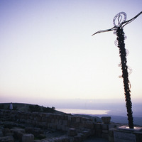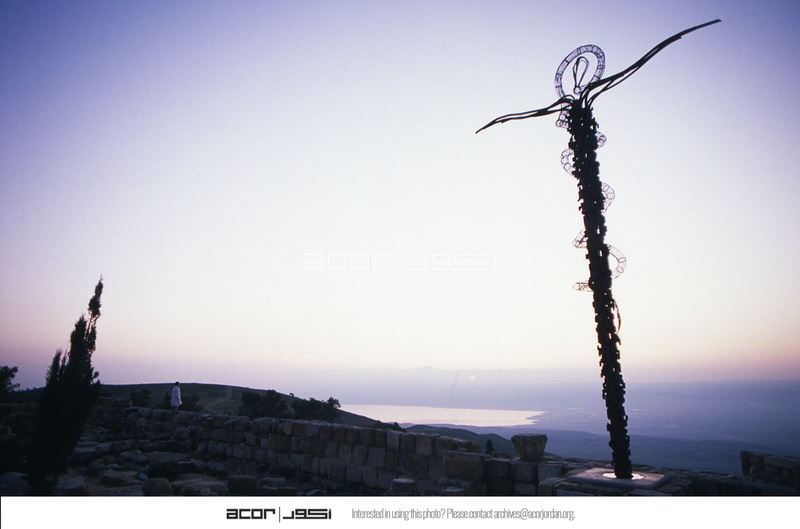 Jordan. Mount Nebo, modern cross, the 'Brazen Serpent Monument' and Dead Sea in background