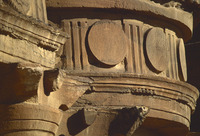 Petra, Mughar an-Nasara , detail of carving of shields on Triclinium façade