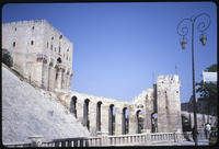 صورة تبين الجسر الواصل بين المدخلين الخارجي والداخلي لقلعة حلب، يتوسطهم أحد بروج القلعة