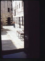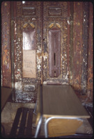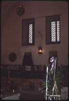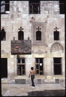 باب في وسط إيوان بيت أجقباش في حي الجديدة، يظهر أعلاه ملصق حافظ الأسد