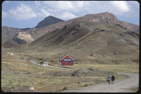 منظر طبيعي وعلامة حمراء على شكل منزل ، مع ظهور قصر إسحاق باشا على من الخلف