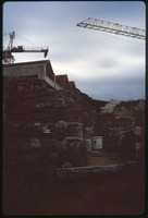 أنقاض مع مباني حديثة ورافعات