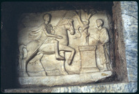 نقش بارز يصور رجل على ظهر خيل وأفعى ملتفة على شجرة