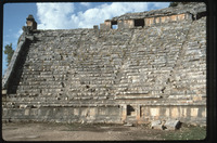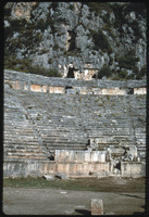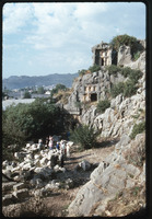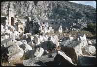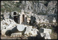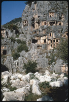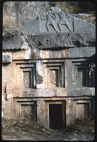 تفاصيل واجهة مقبرة منحوتة في الصخر مع نقوش بارزة
