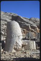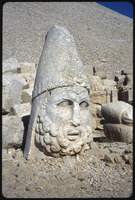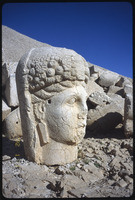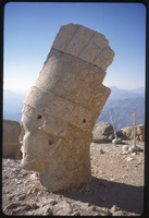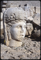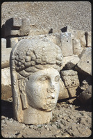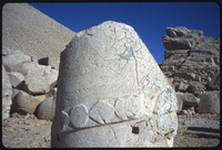 تمثال لرأس إنسان مع نقوش بارزة لشاهد في الخلفية