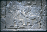 تفاصيل نقش حثي يصور رجلاً وطفلًا فوق ثور