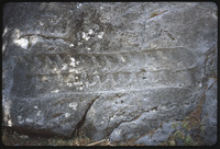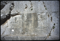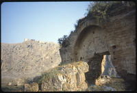 View of rocks and growing plantlife with ruined arch barely visible behind