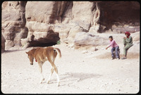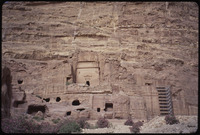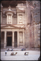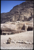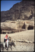 Facade of the urn tomb in Petra, and a Bedouin man riding a donkey
