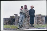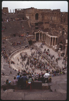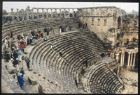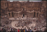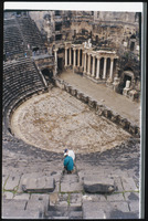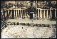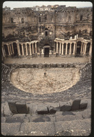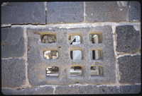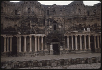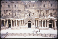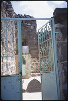 منظر من خلال البوابة يظهر داخلها حجر منقوش باللغة العربية