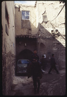 من أحد أزقة دمشق القديمة يظهر فيها طفل راكب على حمار وسيارة ونافذة مبنى قديم