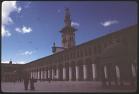 فناء الجامع الأموي تظهر فيه مئذنة العروس وقبة الساعات