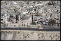 منظر من سطح قلعة حلب يظهر فيه المسجد الصغير( مقام النبي ابراهيم السفلي) ومدخل إلى قاعة العرش