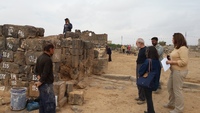 Jordan. Umm al Jimal, Bert de Vries, ACOR director Barbara Porter, Huda Kilani of USAID SCHEP, and local workers working on the restoration of Commodus Gate