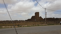 Jordan. Umm al Jimal, street view of barracks and barracks tower, skyline of ancient Umm al Jimal in background