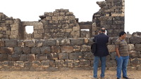 Jordan. Umm al Jimal, Abdul Qader Al-Housan and local community member looking at apse of the Cathedral from the outside