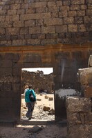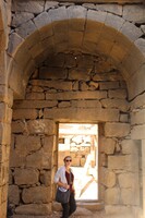 Jordan. Umm al Jimal, the West Church, Maria Trogolo walking through doorway
