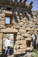 Jordan. Umm al Jimal, site steward Muaffaq al-Masaeed and Sofia Smith, corbelling, lintel