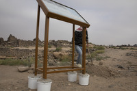 Jordan. Umm al Jimal, Quarry Reservoir interpretive sign sitting in buckets of cement, to be then inserted in the ground by local worker pictured