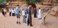 الأردن. وادي رم، جبل الخزعلي، زوار إلى الموقع بجانب لوحة تفسيرية تم تصميمها وتركيبها بدعم من المركز الأمريكي للأبحاث من خلال مشروع استدامة الإرث الثقافي بمشاركة المجتمعات المحلية