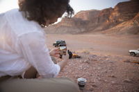 الأردن. وادي رم، عضو من فريق مشروع استدامة الإرث الثقافي بمشاركة المجتمعات المحلية أثناء التقاطه مجموعة من الصور للموقع