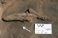 Close-up view to east of iron piece with nail in-situ. - Sq. K3. Locus 19/FN1.