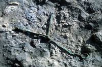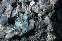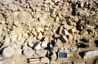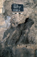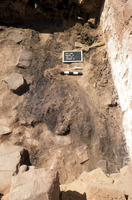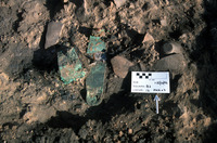 Close-up view to east of Cu/Cu alloy pieces in-situ. ( taken withour card in frame) CS only - Sq. B2. Locus 12/FN8.