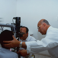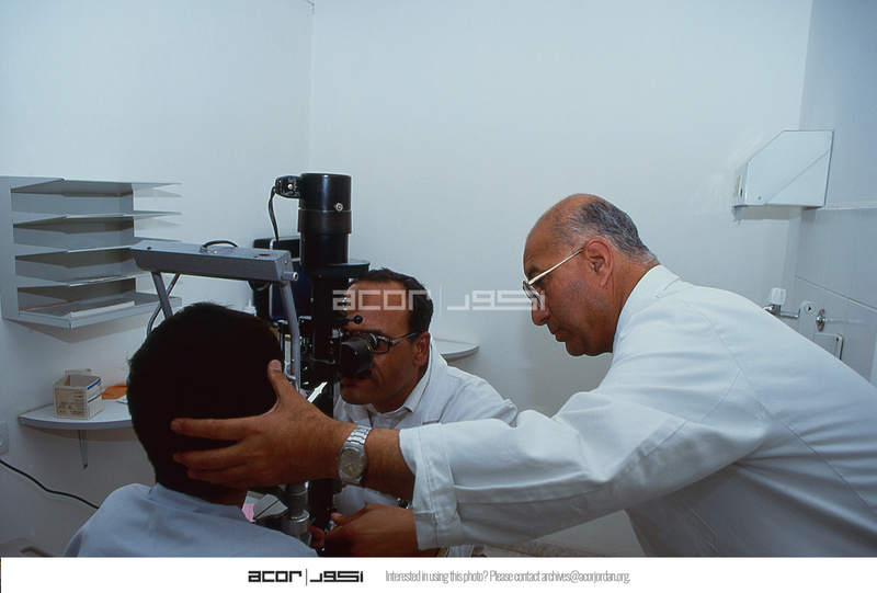 Palestine. Gaza, St .John Ophthalmic clinic. Doctor examines boys eyes, assisted by charge nurse
