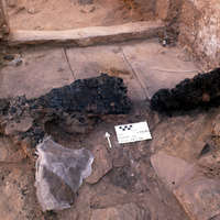 Close-up of burnt wood & door hinges. View ot north-east. - Sq. J4. Loci 23, & 24.