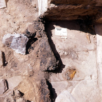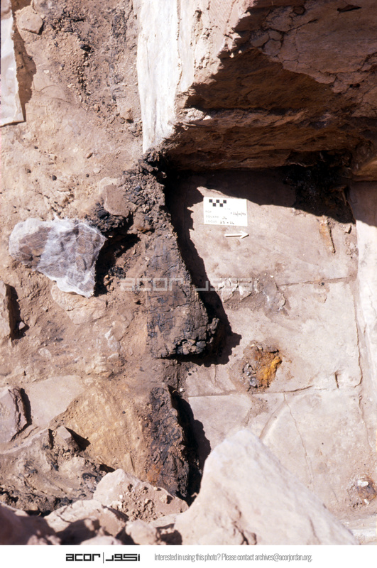 Close-up of burnt wood & door hinges. Top view to west. - Sq. J4. Loci 23, & 24.