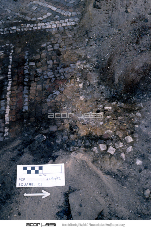 View to west. Mosaic damage - Sq. C1. Mosaic damage