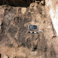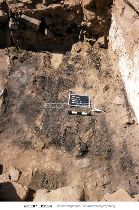Burnt wooden planks and mosaic. View to west. - Sq. J3. Loci 08 & 19.
