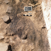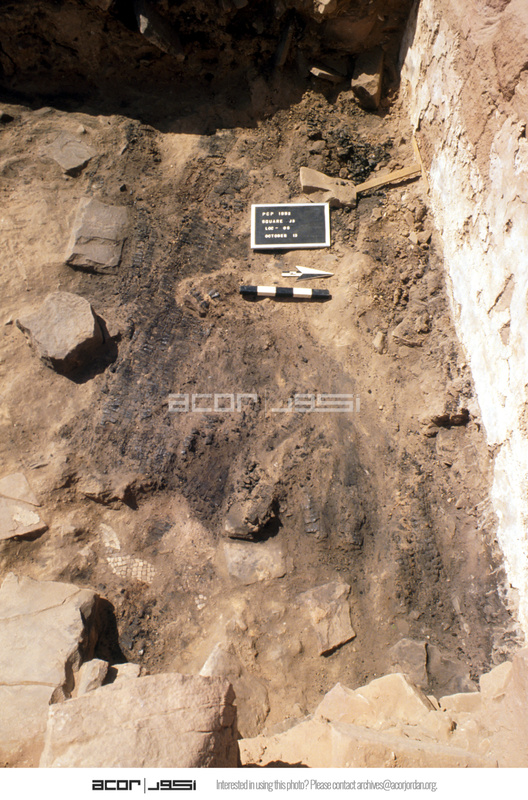 Burnt wooden planks and mosaic. View to west. - Sq. J3. Locus 08.