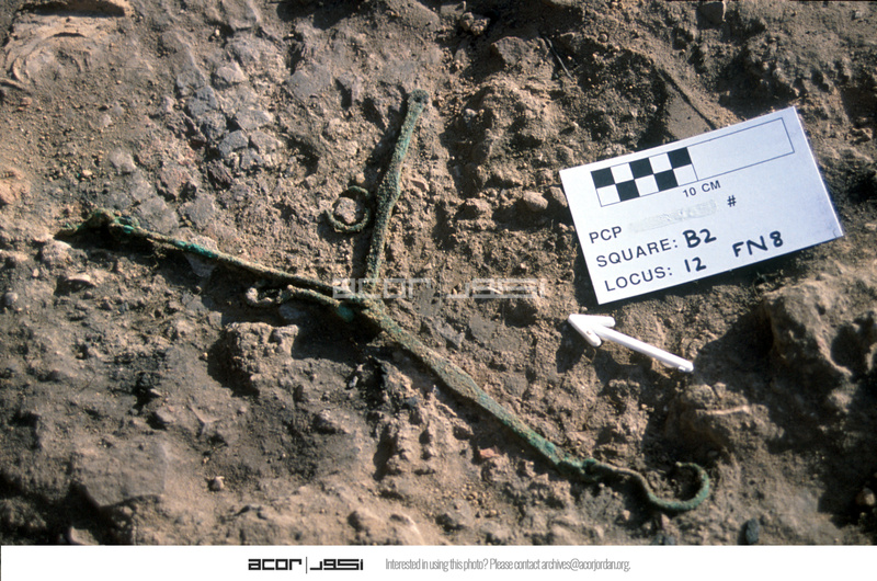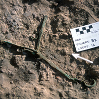 Close-up view to east of Cu/Cu alloy pieces in-situ. (refer to CS 38/12 & 13). - Sq. B2. Locus 12/FN8.