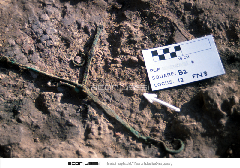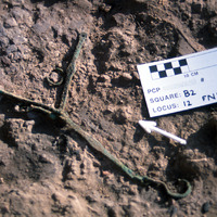 Close-up view to east of Cu/Cu alloy pieces in-situ. (refer to CS 38/12 & 13). - Sq. B2. Locus 12/FN8.