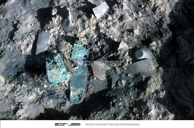 Close-up view to east of Cu/Cu alloy door hinge in-situ. (taken withour card in frame). CS only. - Sq. B2. Locus 12/FN6 & 7.