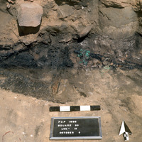 General view of Cu/Cu alloy door hinge and surrounding burnt wooden remains. - Sq. B2. Locus 12/FN1 & 2.